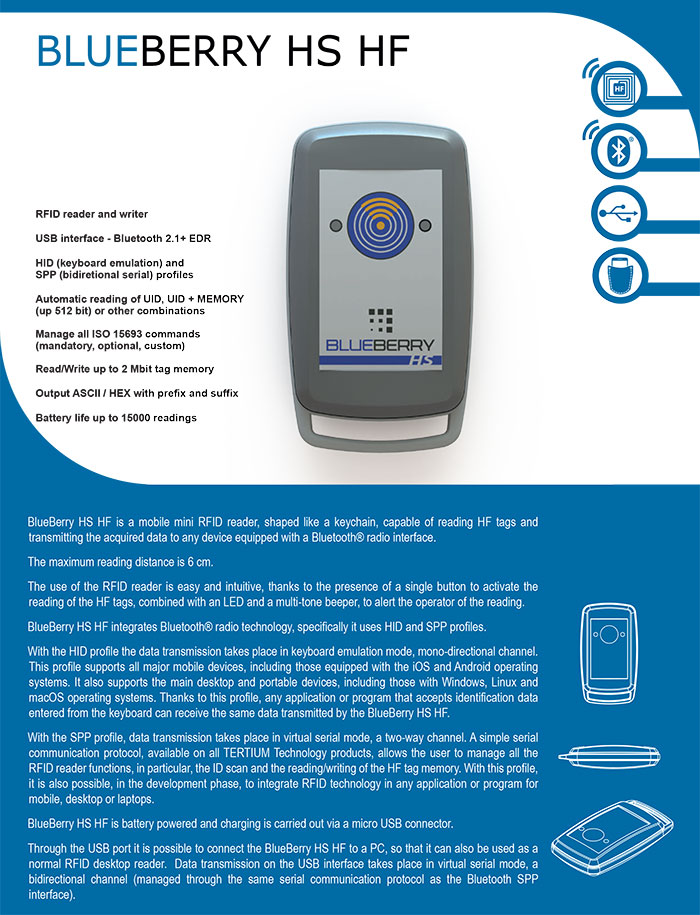 BlueBerry HS HF is a mobile mini-RFID reader, shaped like a keychain, capable of reading HF tags and transmitting the acquired data to any device equipped with a Bluetooth® radio interface.